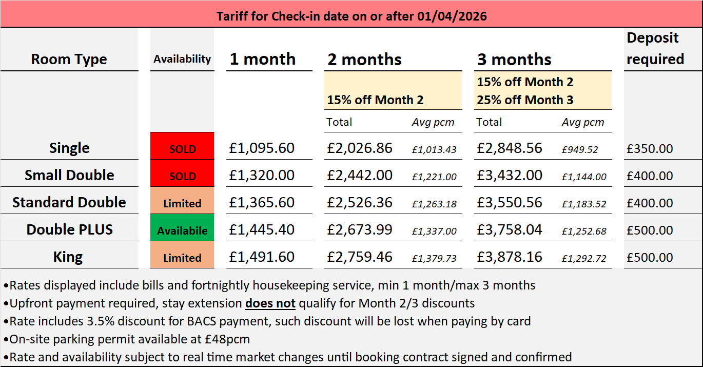 *The Licensee does NOT have right to automatically renew and/or extend their License Agreement upon expiration. Any stay extension will be contracted by a separate Licence agreement, subject to availability and rate at the time, Month 2/3 discount is not applicable for stay extensions.